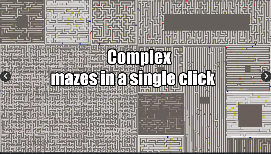 - Customizable Maze Generation, adjustable width/height, corridor bias, braiding, central area, exit passages, random wall passage, special floor tiles, entrances, terrain generation.